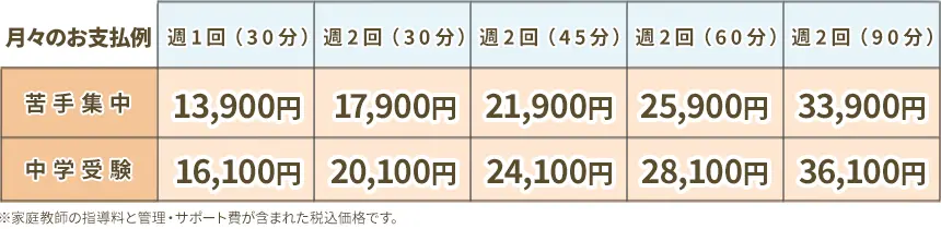 - 管理・サポート費はご家庭が希望される家庭教師の指導方法に対応するため、専門分野に特化した能力を持つ家庭教師が必要になるなどそれぞれの学習スタイルに適応させるための費用となります。