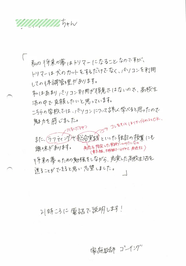 FAXによる添削の後に、電話で学習スタッフが面接官代わりになって質問したり再度話す内容を考えたりとバックアップ体制が出来ています。